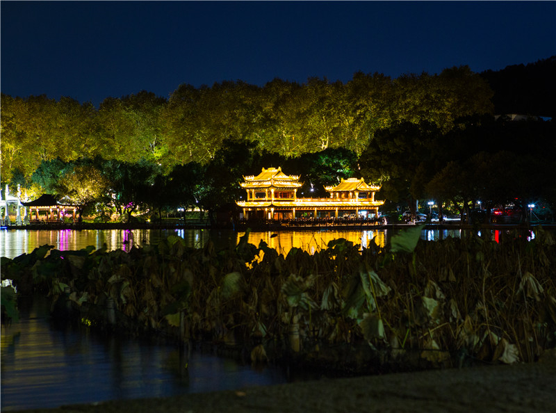 1 杭州夜色下西湖邊上建筑群燈光秀,夢回唐朝